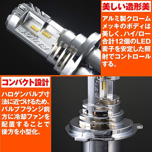 【仕様2】アルミ製クロームメッキボディに、電動冷却ファンをバルブフランジ前方に配置。ハロゲンバルブと同等寸法だから、取付場所や配線の取り回しに悩むことはありません。