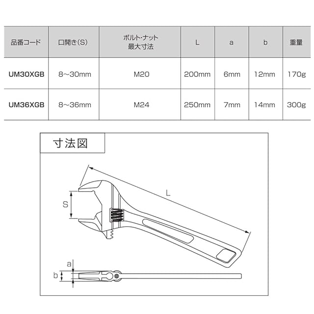 商品名:ロブテックス ハイブリッドモンキレンチX W-ZERO UM36XGB 全長250mm