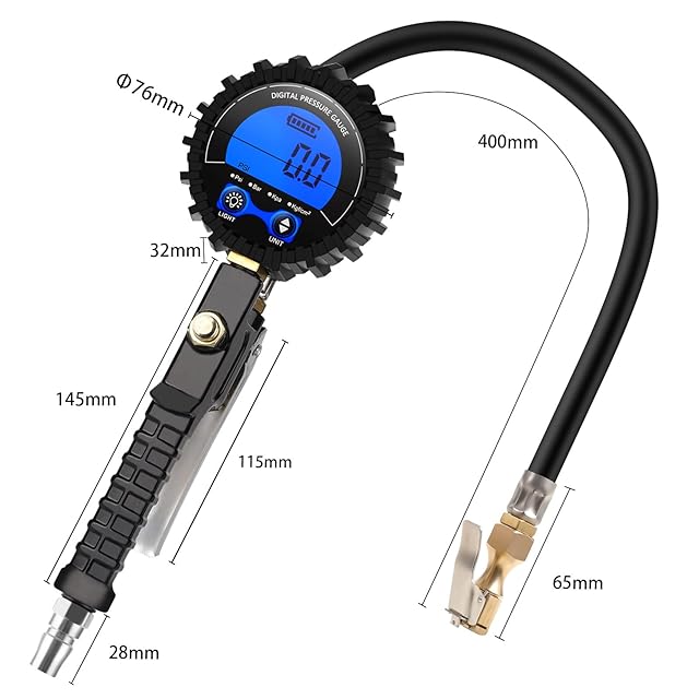 レンジ:3-200PSI 3-1400Kpa 3-14Bar 3-14Kgf/cm² 精度:±1% 最小単位:0.1(PSI) バルブ:米式バルブ チャック形状:押し付け式 ディスプレイ:バックライト付きLCD 測定単位:PSI,Kpa,Bar,Kgf/cm² 互換性:NPTエアコンプレッサコネクタ