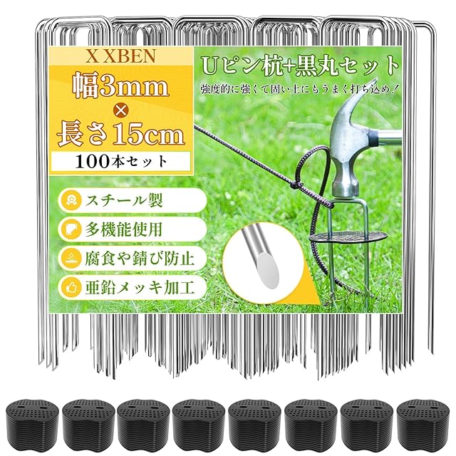 商品名:X XBEN 防草シート 固定ピン 黒丸付き 幅3mm 長さ15cm 100本セット 除草シート Uピン杭 雑草防止シート 園芸シート杭 人工芝 ピン ビニールマルチ 固定用 押さえピン 農業用防虫ネット フック コ型ピン 農業用 変形に強い ステンレス 釘