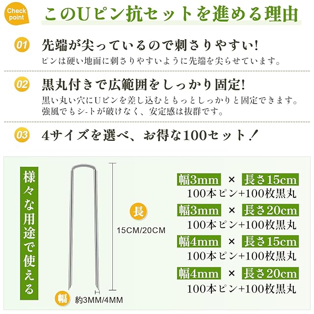 【取付簡単】u字ピン先端には鋭くきれいな角度の切れ込みがあり、芝生、防草シート、ビニールシート、重い土などを簡単に素早く貫通させることができます。手やハンマーなどで土に差し込むことができます。再利用できますので、使用した固定ピンを清潔にして保存し、次回の使用に備えます。ご注意:先端が尖ってます。怪我を防止するため開封または設置の際、必ず手袋を着用ください。
