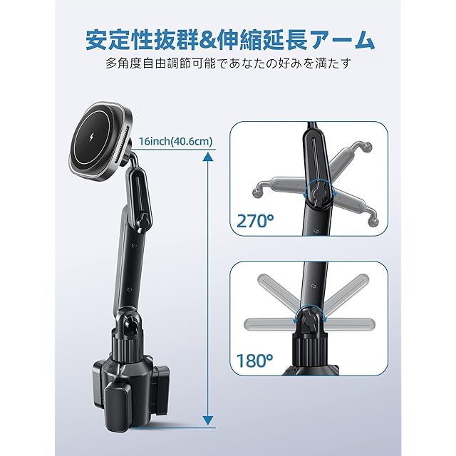 【強力な磁力】:当社のカップホルダー型携帯電話ホルダーワイヤレス充電器は、14個のN52配列マグネットを搭載しており、二重層の拡張された厚みのある磁気吸着力で強力な磁力を提供します。これにより、さまざまな道路状況でも携帯電話をしっかりと固定でき、快適なドライブ体験をお楽しみいただけます。