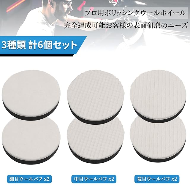 【3種類6個セット】荒目x2(表面のモノグラムのテクスチャー)、中目x2(十字型の表面テクスチャー)、細目x2(表面テクスチャーなし)3種類プロ用ポリッシングホイール-完全達成可能お客様の表面研磨のニーズ