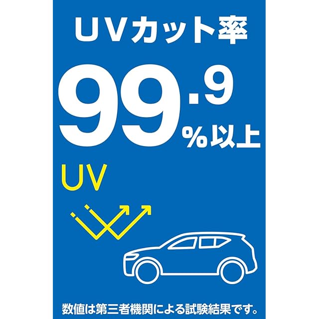 UV カット率、遮光率 99.9%以上。遮熱効果約-20℃。紫外線・熱から車内を守ります。