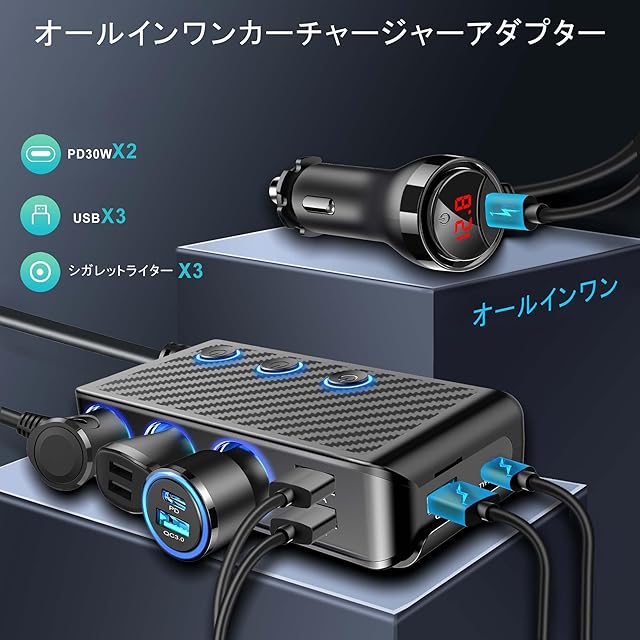商品名:シガーソケット 216W 3連 USB車載充電器 増設 ソケット Quick Charge 3.0 搭載USB Type-C急速充電増設カーチャージャー 電源ソケット 分配器 車載充電器能搭載 12V/24V車対応 カーチャージャー