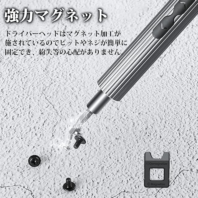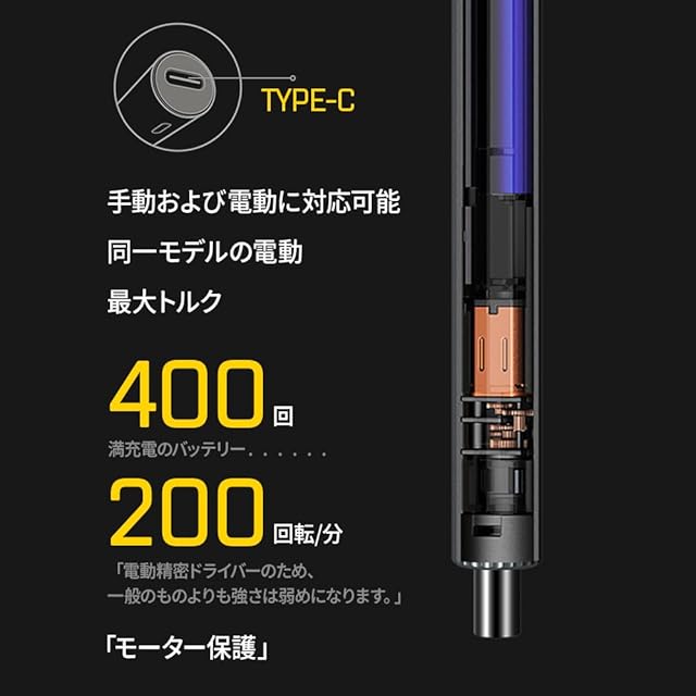 【お子様や女性にも安心】本体の重さはわずか54g(およそ卵1個分)と超軽量設計のため女性でも安心して使用できます。ボタン操作で正回転、逆回転、LEDライトモード、3モードの切り替えができるので、お子様でも直感的に操作してDIYを楽しめます。最大電動トルク:0.25 N.m 手動トルク:0.35N.mとパワフルなためドライバーにかける力も少なく使用者に優しい設計となります。最大回転数は毎分200回転と高出力を実現できるため、あらゆる組立分解の作業効率を上げることができます。