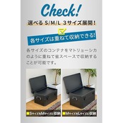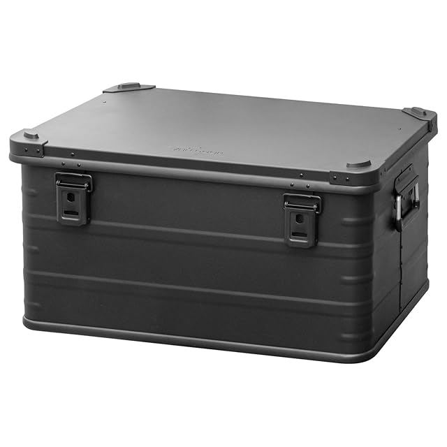 収納・移動をより快適に<br> キャンプギアを纏めることができるオシャレなマットブラックカラーのアルミコンテナボックス。用途で選べるS/M/Lサイズがラインナップ。各サイズのコンテナを重ねて省スペースで収納することが可能です。<br> <br> 丈夫なアルミ製BOX<br> 素材は軽量で耐久性の高いアルミ製。使い込むほどに風合いが刻まれ、無骨な雰囲気を醸し出します。塗装は傷がつきにくいオシャレな艶消しブラックの粉体塗装、スタイリッシュに仕上げています。<br> <br> ロースタイルにぴったり<br> アルミ製天板は熱に強く、水や油も簡単に拭き取ることができます。テーブルとしてもおすすめ。オシャレなデザインはお部屋にも馴染みます。ローテーブルや収納ボックスとして、雑貨や衣類、工具入れにも最適です。<br> <br> ・天板フタはバックルでしっかり固定<br> ・別売の錠前を使用すればロックも可能<br> ・内蔵されたバネによりガタつきを抑えた持ち手<br> ・天板はベルトで固定され開いた状態を保てます<br> ・同サイズでスタッキング可能<br> ・スタッキング時のズレ防止にも便利なコーナーガード<br> ・縁のクッション材でフタ開閉時の衝撃を緩和<br> <br>