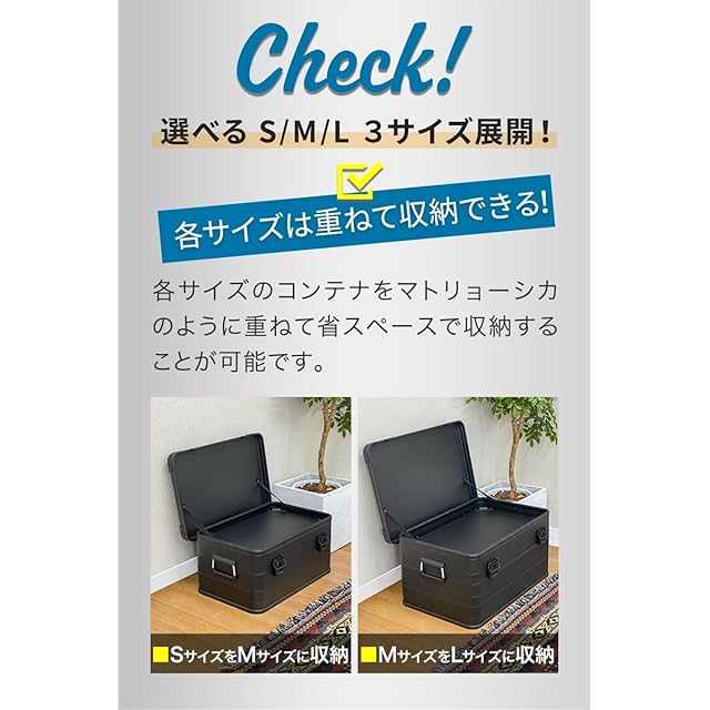 ✅【収納・移動をより快適に】キャンプギアを纏めることができるオシャレなマットブラックカラーのアルミコンテナボックス。用途で選べるS/M/Lサイズがラインナップ。各サイズのコンテナを重ねて省スペースで収納することが可能です。