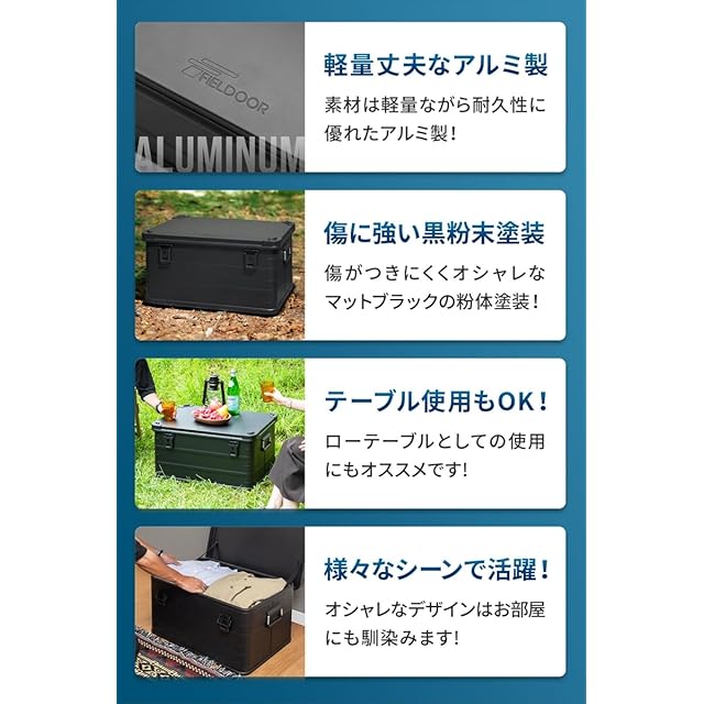商品名:FIELDOOR アルミ コンテナ ボックス 蓋付き 【マットブラック】 収納ボックス フタ付き 収納ケース 収納BOX おしゃれ 道具入れ ストッカー 軽量 スタッキング BOX アウトドア キャンプ 収納箱 テーブル [Lサイズ]