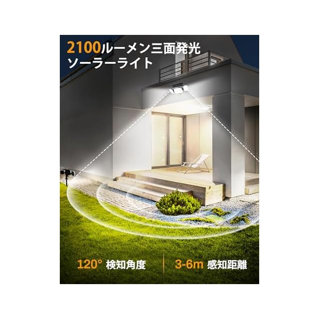 ※【3面発光で広範囲爆光照射】このソーラーライトは昼光色7000k超高輝度の208個LEDチップを搭載しており、最大光束で2100ルーメンを達し、光を無闇の空に散らずに照明したい場所をしっかり照らします。3面発光ソーラーライトが両側のライトは左右回転可能で、360°照明角度がに達し、夜間センサーライトの照明範囲が大幅に広くなります。