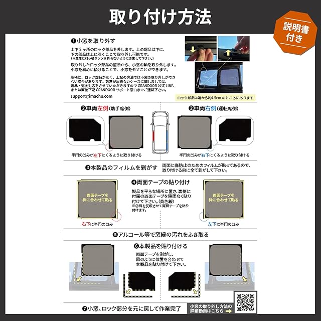 取り付け簡単。丁寧な説明書付き。 小窓とガラスの間に、防水両面テープを使用して網戸を固定するシンプルな設計です。ボディへの直接的な加工や特殊な道具は不要です。