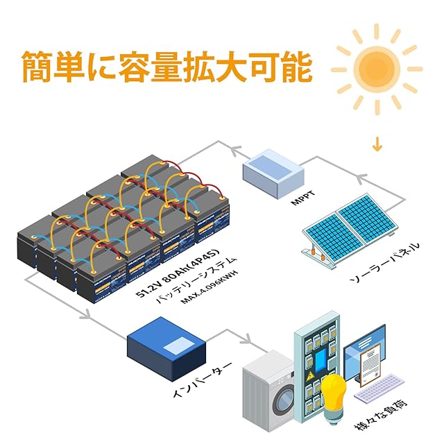 【容量をさらに大きく】GOLDENMATEのLiFePo4バッテリーは、直列・並列接続が可能で、必要に応じて電圧や容量を増やすことができます。バッテリーは最大4本まで直列または並列に接続でき、最大51.2V 80Ahまで増加させることができます。バッテリーの充電には専用のリチウムバッテリー充電器を使用してください。また、バッテリーを4本以上直列または並列に接続しないでください。