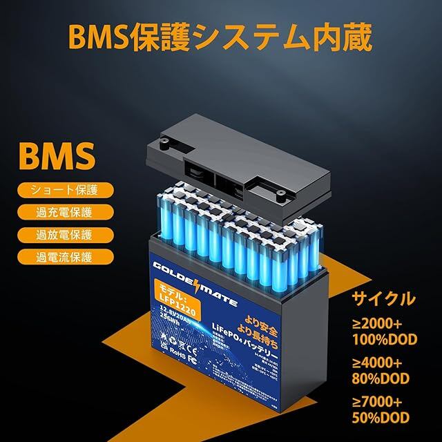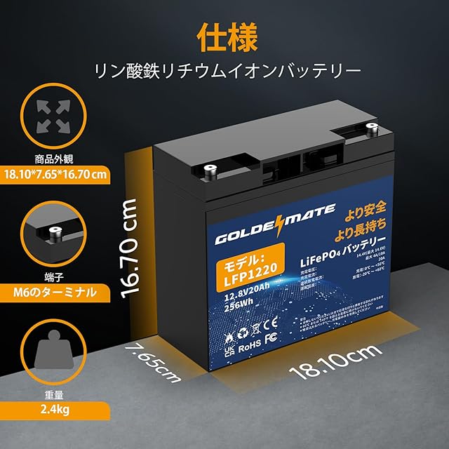 GOLDENMATE 12.8V 20Ah LiFePO4バッテリー リン酸鉄リチウムイオンバッテリー 256Wh BMS内蔵20A 2000以上のサイクル 小型 高性能 キャンピングカー 電動車椅子 車中泊 サブバッテリー 非常用電源 ソーラー発電システム LFP1220