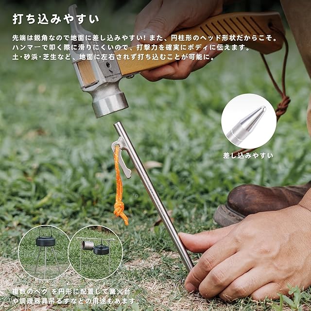 【打ち込みやすい】: 先端は鋭角なので地面に差し込みやすい! また、円柱形のヘッド形状だからこそ。ハンマーで叩く際に滑りにくいので、打撃力を確実にポディに伝えます。土・砂浜・芝生など、地面に左右されず打ち込むことが可能に。