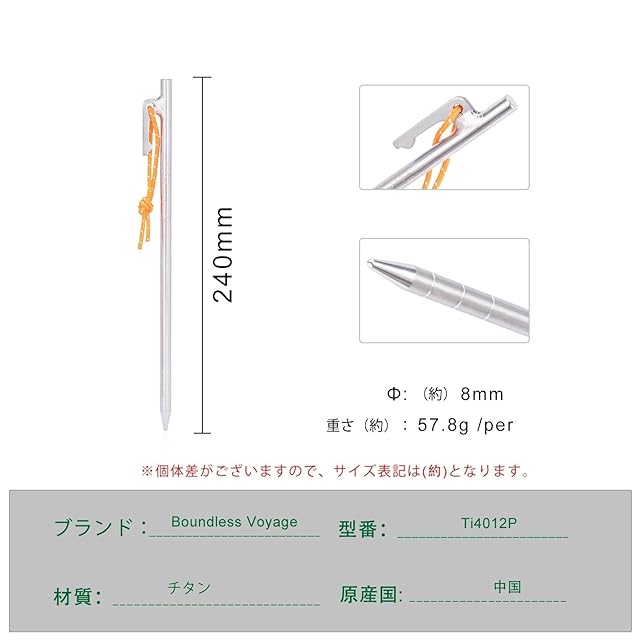 ブランド:Boundless Voyage<br/> 型番:Ti4012p<br/> サイズ:長さ24cm x 直径8mm<br/> 重量:約57.8g/本<br/> 材料:チタン合金<br/> 原産国:中国<br/> <br/> 特徴:<br/> 1、錆びなく、頑丈高強度のチタン合金で作られているので、折れたり曲がったりしません。<br/> 2、高強度のチタン合金ペグは耐腐食性、耐久性に優れています。<br/> 3、テント固定がしっかりして、軽くて持ち運びが便利なテント専用のペグ キャンプ設営用具。<br/> 4、山地キャンプ場は草地・硬い地面ですからキャンプファンにとって金属ペグは必需品です。