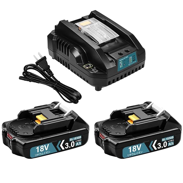 <br>商品の説明 マキタ 18v バッテリー 充電器セット マキタ バッテリー 18v 充電器セット <br><br>型番:マキタ 互換バッテリー BL1830B <br>電圧: 18v <br>容量: 3000mAh <br>電池種類:リチウムイオン 電池 <br>個数:2個 <br>LED4段階残量表示+自己故障診断<br>認証:PSEマーク CEマーク取得済み <br>対応充電器:充電器DC18RA、DC18RC、DC18RD、DC18RDFなどに対応できます。充電方法:充電方法は純正品と同じです(純正・互換充電器とも充電できます)。<br>マキタ 互換充電器DC18RC<br>入力:100~220V 50/60Hz<br>出力:14.4-18V <br>適合バッテリー: <br>マキタ 14.4V:BL1415N/BL1430/BL1430B/BL1440/BL1450/BL1460B/BL1490B <br>マキタ 18V:BL1815N/BL1820/BL1830B/BL1840/BL1850B/BL1860B/BL1890Bなど(マキタ純正 DC18RC 充電器対応機種に準ずます)<br><br>参考値・充電時間: <br>BL1860(18V-6.0Ah):55分 <br>BL1460(14.4V-6.0Ah):55分<br>BL1850(18V-5.0Ah):45分<br>BL1450(14.4V-5.0Ah):45分<br>・BL1840(18V-4.0Ah), <br>BL1440(14.4V-4.0Ah):36分<br>・BL1430(14.4V-3.0Ah) <br>BL1830(18V-3.0Ah):22分<br>・BL1815(18V-1.5Ah), <br>BL1415(14.4V-1.5Ah):15分<br><br>対応機種<br>TD145DRFXB TD145DRFXL TD145DRFXP TD145DRFXWTD146DRFP TD146DRFXB TD146DRFXL TD146DRFXW TD146DZ TD147DRFX TD147DZ TD251DRFX TD251DZ TD171D <br>マキタ MUR シリーズ MUR181DRF MUR181DZ MUR185UDRF MUR190SDST MUR191LDZ MUH305DRF MUH365DRF <br>マキタ MUS シリーズ MUS104DSH MUS104DZ MUS154DSH MUS154DZ <br>マキタ PB シリーズ PB108D PB108DRFX PB108DZ PB180DRFX <br>マキタ PT シリーズ PT351D PT351DRF PT351DZK <br>マキタ TP シリーズ TP140DRFX TP141DRFX TP141DZ <br>マキタ TW シリーズ TW251D TW251DRFX TW450DRFX <br>マキタ UB シリーズ UB182D UB182DRF UB182DZ UB183D <br>マキタ VR シリーズ VR350D VR350DRFX VR350DZ VR450D VR450DRFX VR450DZ <br>マキタ HS シリーズ HS630DRFX HS630DRFXW HS630DZHS630DZW <br>マキタ TD シリーズ TD140D TD144D TD144DRFX TD144DZ TD146DRFX <br><br>長期保存に強い <br>自己放電が少ないため、長期保存しても満充電に近い作業が可能です。 <br>高温や過放電、過負荷状態になると自動的に電気を遮断してバッテリーを守ります。<br>品質に自信があるから、できます。 <br> 【マキタ18vバッテリーBL1860B特徴】 マキタ用リチウムバッテリーとして開発されたバッテリーは、純正品と変わらない 使用感でこれまで多くのお客様にご利用頂いております。<br> 強制冷却で(快速)充電><br>自己放電が少ないため、長期保存しても満充電 に近い作業が可能です,制御基板には充電を制御する保護回路を搭載!<br>√小型 軽量 高容量<br>√通常のタイプとほぼ同じ厚みで収納ケースにも収納可能。 <br>専門的な設備で寿命試験を操作しております。<br> ①ボタン破壊試験<br> ②バッテリーを充電器に着脱 <br>③バッテリーを充放電 <br>④落下試験 工場から出荷前に正規テストを繰り返すことで 高品質を守っております。安格ですが、 商品の耐久性や性能は純正品と遜色がないです。自信を持ってお勧めします。
