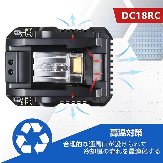 【DC18RC 商品仕様】型番:マキタ 充電器 DC18RC 入電圧:100ー240V 入力周波数:50ー60Hz 出力電圧:14.4-18v 適合 マキタ バッテリー BL1430、BL1440、BL1450、BL1460、 BL1815、BL1830、BL1840、BL1850、 BL1860、BL1430B、BL1460B、BL1830B、 BL1850B、BL1860B など充電可能です。充電完了メロディ付きます。高い冷却効率:冷却属の流れを最適化することで、全てのバッテリセルを効率よく均一に冷却します。バッテリー状態を診断:高温、満充電後の再充電、過放電など。