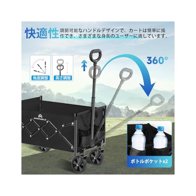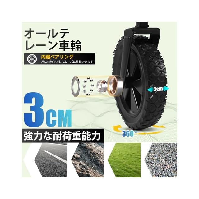 【全地形対応360°ホイール】前輪は360°回転可能で、砂地、芝生、でこぼこした道でもスムーズに移動できます。押し引きがラクで、最小限の力で操作可能。さらに、ホイールには静音ベアリング技術を採用し、作動音は50デシベル以下に抑えられています。そのため、キャンプ場や公園などの静かな環境でも音を気にせず使用でき、ペットを驚かせたり、家族の楽しい時間を邪魔したりする心配もありません。この設計により、利便性と移動のしやすさが大幅に向上し、さまざまなアウトドアシーンで活躍します。