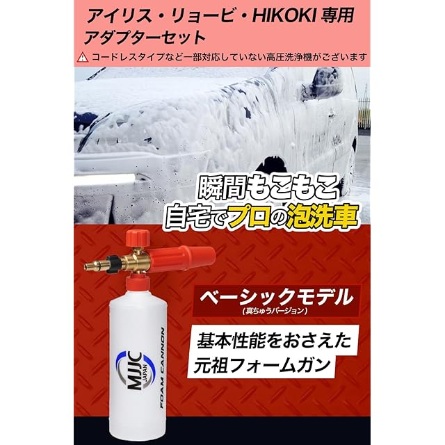 ✅【泡性能を最大限に引き出すためにご確認ください】 ●MJJC純正のフォームガン専用シャンプー【神泡】がおすすめです。●シャンプーの性能により泡立ち具合は変わります。(泡だちの悪いシャンプーもあります。)●MJJC純正のシャンプーを使用しても泡が出ない場合は、以下の内容を見直して下さい。 ・1.1mmまたは1.25mmのノズルがしっかり本体に取り付けられていますか? ・本体に吸引チューブは取り付けられていますか? ・泡量の調節ダイヤルが最小になっていませんか? ・高圧洗浄機は正常に機能していますか? 高圧洗浄機本体の推奨圧力性能は90Bar(9MPa)以上です。この数値を下回る高圧洗浄機でご使用の場合は、付属の1.1mmノズルに交換することにより、最適な泡の状態に近づけることができます。