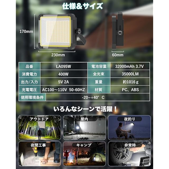 商品名:【大光量・軽量化】SUKITEN 投光器 充電式 led 作業灯 屋外 400W 35,000lm 32,000mAH大容量 ワークライト IPX4防水 超高輝度 USB/ソーラ充電 3つ点灯モード 16時間連続点灯 便携式 マグネット フック付き 無段階調光 キャンプ アウトドア 屋外照明 夜間工事 防災 夜釣り 常備灯 停電対策 非常用