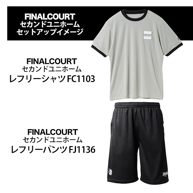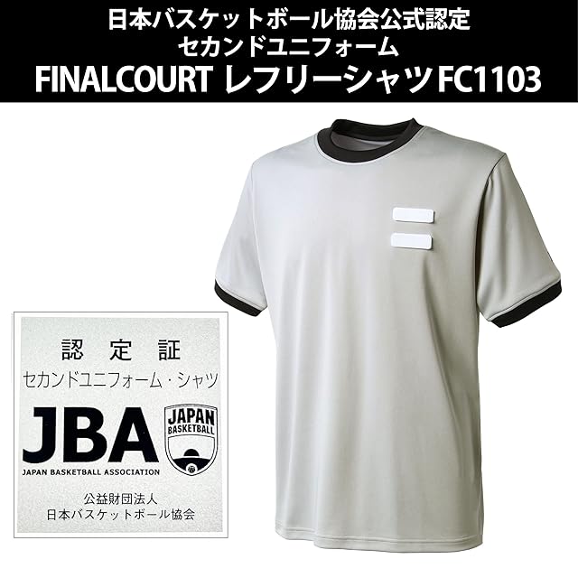 <b>日本バスケットボール協会公式認定審判レフェリーウェア セカンドユニフォーム<br> FINALCOURT ファイナルコート バスケットボール ウェア レフリーシャツ FC1103</b><br><br> 日本発のバスケットボールブラント、FINALCOURTのレフェリー用のラウンドネック半袖シャツです。<br>JBA(日本バスケットボール協会)のセカンドユニフォームの公認を受けたウェアで、袖に公認ロゴのプリントと公式認定証のタグが付きます。<br>このため、左胸に付いたマジックテープを使って公認ワッペンを付ければ、一部のトップレベルを除く夏季の公式戦のレフェリングが可能です。<br>同じFINALCOURTのJBA公認セカンドユニフォーム・レフェリーパンツとのセットアップでのご購入をお勧めします。<br>吸汗速乾素材が快適なコンディションをキープします。<br><br> ※レフェリーウエアセカンドユニフォームを公式戦でご使用の場合には、使用可能な期間、公式戦等について、日本バスケットボール協会発行の「2020バスケットボール競技規則」でご確認ください。 2020年から運用されている新ルールですので、以前のルールブックには記載はありません。<br><br> 【カラー】グレー1色(襟首、袖口:ブラック)<br> 【サイズ】メンズ全5サイズ S、M、L、O、XO<br> 【素材】ポリエステル100% 吸汗速乾素材<br> 【機能】公認レフェリーワッペン取り付け用マジックテープ<br> 【原産国】中国<br><br> 【仕上がり寸法(cm)】<br> S:着丈49、身幅66、肩幅40.0、袖丈21<br> M:着丈51、身幅68、肩幅41.5、袖丈22<br> L:着丈53、身幅70、肩幅43.0、袖丈23<br> O:着丈55、身幅72、肩幅44.5、袖丈24<br> XO:着丈57、身幅74、肩幅46.0、袖丈25<br><br> <b>【適合サイズ(cm)】</b><br> S:身長162-168、胸囲80-88、胴囲66-74<br> M:身長167-173、胸囲88-96、胴囲74-82<br> L:身長172-178、胸囲92-100、胴囲78-86<br> O:身長177-183、胸囲96-104、胴囲82-90<br> XO:身長182-188、胸囲100-108、胴囲86-94<br>