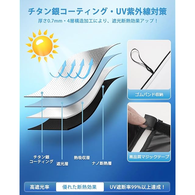 ✔2.【改良版・高密度生地4層構造】本製品はアルミ箔反射層と極厚な高密度不織布を採用し、99.9%の紫外線を効果的に遮断します。高い断熱効果が得られる4層構造により、夏は強い日差しを反射して車内温度の上昇を抑え、紫外線から車内を守る、快適な車内空間を実現します。断熱・UVカットの特殊生地で夏でも冬でも一年中大活躍するこだわりと圧倒的品質を誇る高密度サンシェード。断熱遮光日よけ抜群!