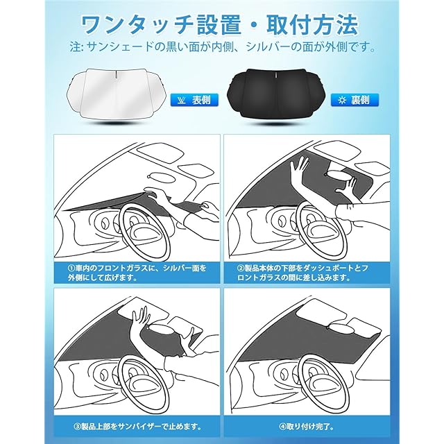✔3.【UVカット・断熱・内装劣化防止】①99%の有害な紫外線を効果的に遮断し、駐車時の大事な愛車を太陽光による損傷やハンドル焼け、ダッシュボードなどの樹脂部分の日焼けからを守る、使用寿命を延長します。②4層断熱材を採用し、車内の温度を軽減し、エアコンへの負荷がへり、省燃費が向上します。内装劣化防止、車内温度の上昇を防ぐサンシェード超おすすめ!