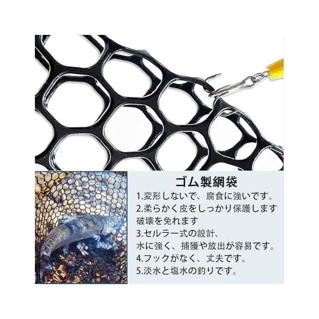 魚に優しいラバーネット:ランディングネットは淡水と海水の両方で使用可能です魚に優しいラバーネットを採用しています。柔らかいラバーネットは、魚の鱗を傷つけずに安全にキャッチでき、魚へのストレスを最小限に抑えます。特に中大型の魚を対象とした場合、この特性は非常に重要です