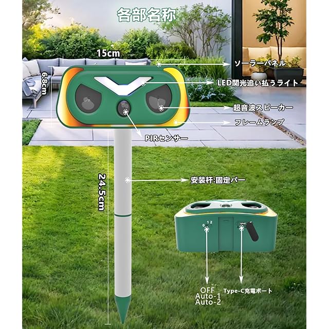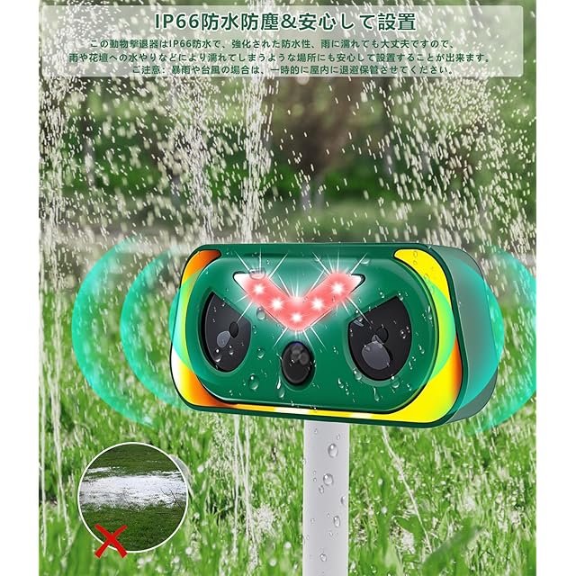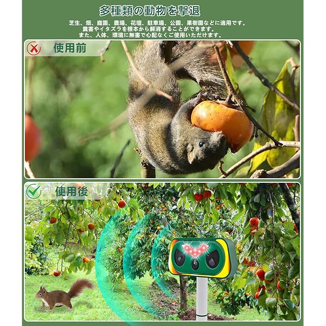 【幅広い適用場所】この害獣対策器超音波周波数範囲は20KHzから30KHzまでで。 動物によって嫌いな周波数の音域が異なるため、動物撃退器から出る周波数の幅を変えることで。猫、犬、ネズミ、モグラ、ドブネズミ、コウモリ、鳥、キツネ、アライグマ、ノイシシ、イタチなどの動物が撃退できます。動物撃退器が使用禁止食品工場、騒音、フン尿、食害や動物の糞便などにお困りの方にオススメです。芝生、畑、庭園、農場、花壇、駐車場、公園、果樹園などに適用です。 ⭐日本語取扱説明書が付属、使用中、ご不明な点がございましたら、遠 慮なく、ご連絡ください。