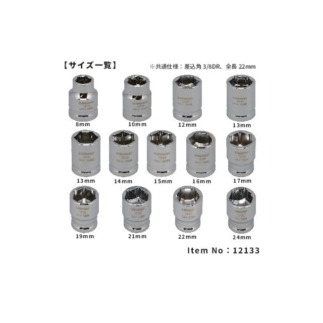 商品名:SIGNET(シグネット) 全長22mmの超短型で狭所作業もお任せ! 3/8DR 13個組 ショート6角ソケットセット ミラー仕上げ ホルダー付 12133