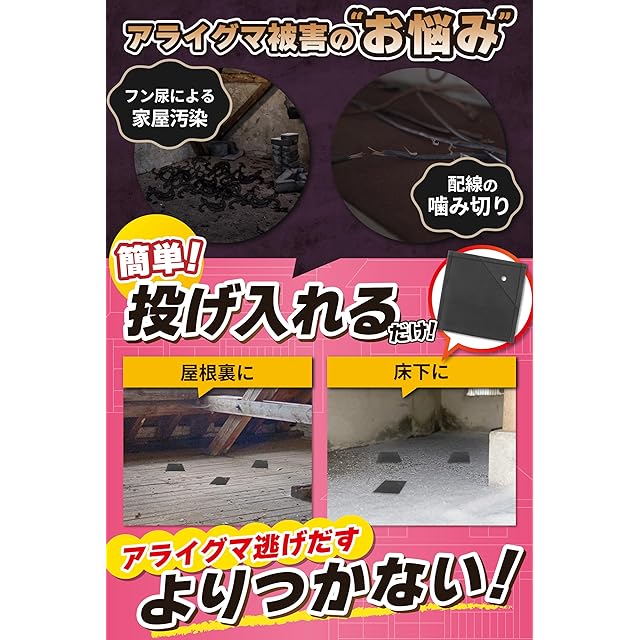 【屋根裏に投げ入れるだけ♪便利な結束ベルト付】「アライグマの寝床」である屋根裏に投げ入れるだけでOK。コンパクトな忌避剤なので扱いやすく、誰でも・簡単に・すぐ設置できます。屋外設置時に便利な結束ベルトが付いています。