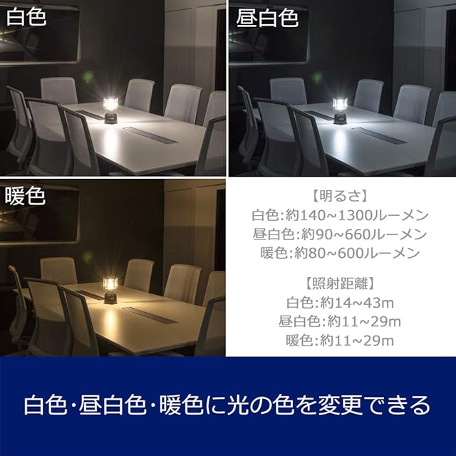 明るさ:白色/1300ルーメン、昼白色/660ルーメン、暖色/600ルーメン