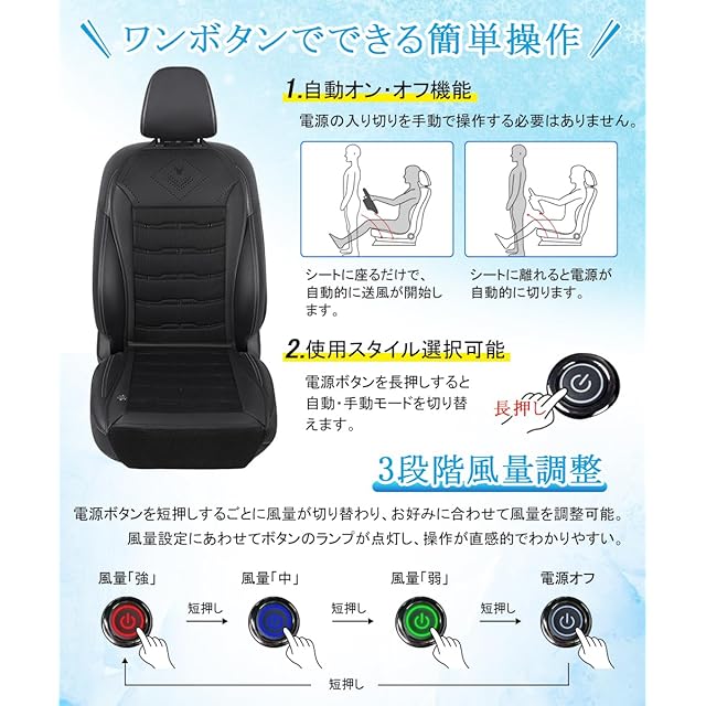 【3段階風量調整可能・自動オン/オフ機能付き】ボタン一つで、風量を強・中・弱の中から自由に調整できます。設定は自動モ一ドの場合、ク一ルシ一トから離れると、自動的に電源がOFFになります。手動で電源を切る必要はございません、非常に便利な機能になります。また、自動モードと手動モ一ドはいつでも自由に切り替わります。