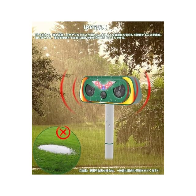 【幅広い適用場所】この害獣対策器超音波周波数範囲は20KHzから30KHzまでで。 動物によって嫌いな周波数の音域が異なるため、動物撃退器から出る周波数の幅を変えることで。猫、犬、ネズミ、モグラ、ドブネズミ、コウモリ、鳥、キツネ、アライグマ、ノイシシ、イタチなどの動物が撃退できます。動物撃退器が使用禁止食品工場、騒音、フン尿、食害や動物の糞便などにお困りの方にオススメです。芝生、畑、庭園、農場、花壇、駐車場、公園、果樹園などに適用です。 ⭐日本語取扱説明書が付属、使用中、ご不明な点がございましたら、遠 慮なく、ご連絡ください。
