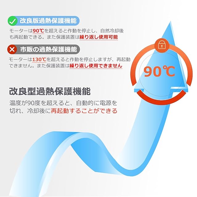 【改良型過熱付き換気扇】本排気ファンには改良型の過熱保護装置が搭載されて、火事のことを効果的に防止します。また保護装置は繰り返し使用可能なのでモーターは90℃を超えると作動を停止しますが、自然冷却後も再起動できます。他の製品の過熱保護機能のほとんどは使い捨てであるので、モーターは130℃を超えると作動を停止しますが、製品が再起動できません。