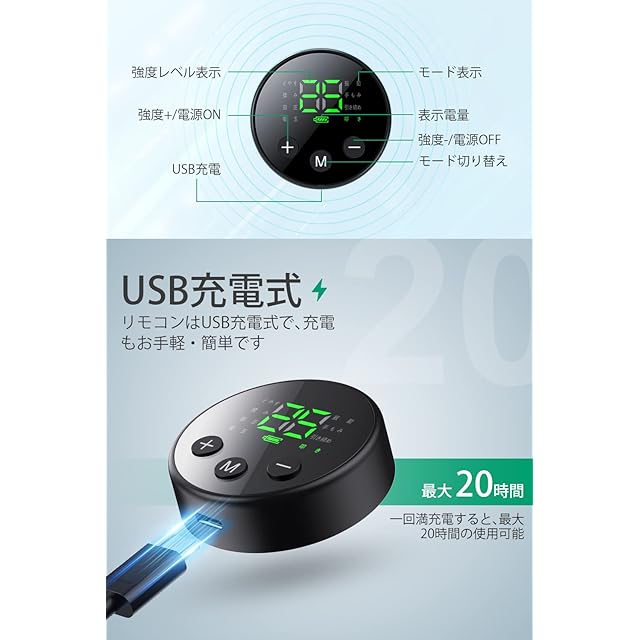 【経済的USB充電式&お手入れも簡単】コードレスで使用できるという便利なEMSマシンで、電池交換不要の充電式を採用され、一度フル充電の状態で、20時間ぐらい使えます。腹筋トレーニング器具は付属のコントローラーは液晶画面が搭載して日本語の液晶画面でモード、強度を表示されます、身体に装着して使用時に、作動している状態(モードの種類、段階の強度)を見て確認できます、もっと安心に、もっと明瞭にトレーニングが楽しめます。 .