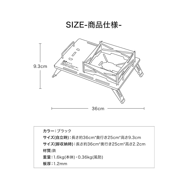 【商品仕様】「カラー」ブラック「サイズ」自立時:約36 x 25 x 高さ9.3cm 脚収納時:約36 x 25 x 高さ2.2cm「重量」約2.0kg「材質」鉄「内容品」本体 / 風防4枚 / 収納袋 / 日本語説明書 ※本製品にシングルバーナーは付属いたしません。