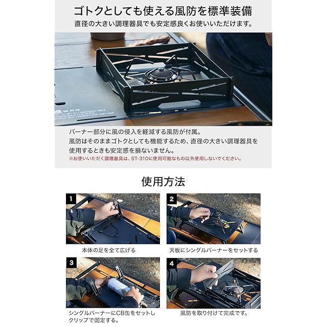 【風防兼ゴトク付き】バーナー部分に風の侵入を軽減する風防が付属。風防はそのままゴトクとしても機能するため、直径の大きい調理器具を使用するときも安定感を損ないません。