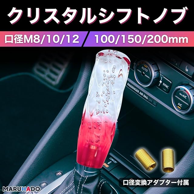 【透明感と幻想的なデザイン】透き通るようなデザインでツートンカラーのシフトノブは、車内の雰囲気をより魅力的にしてくれるアイテムです。ツイストデザインと内部の気泡はどこか幻想的な雰囲気にも感じられます。シフトレバーは車内デザインの中でもより目立つ箇所にあるので、手軽にデコレーションしたい場合には最適。クリアで透明感のあるデザインなので、男性だけでなく女性ドライバーにもおすすめできます。毎日の運転を楽しくさせてくれるアイテムです。<br>【快適な操作性】150mmや200mmの長めのタイプはスムーズなシフトチェンジを実現できます。レバーへの力が入りやすく、重く遠いシフト操作にお悩みの方にピッタリです。長さはショートタイプからロングタイプまで、10cm、15cm、20cmと豊富なサイズ展開。ATやMT車はもちろん、軽自動車から普通車、さらにはトラックまで幅広く対応。快適なドライビングをサポートします。<br>【優れた汎用性】様々な車種に対応できる汎用タイプのクリスタルシフトレバー。本体の口径はM12x1.25で、M8×1.25とM10×1.25の2種類の口径変換アダプターが付属。AT車やMT車、国産車や外車を問わず、多くの車種に取り付け可能です。愛車のインテリアをワンランクアップさせたい方におすすめ。簡単な取り付けで、車内の雰囲気を一新できます。<br>【豊富なバリエーション】あなたの好みや車内の雰囲気に合わせて選べる、多彩なカラーバリエーション。クリアな透明感が特徴的なツートンカラーで様々なバリエーションをご用意。長さは短いタイプから長いタイプまで3種類展開で、車種や好みに合わせて最適なサイズが見つかります。自分だけのオリジナルな車内空間を演出できます。<br>【商品仕様】素材:アクリル、グリップ直径:約47mm(全サイズ共通) ※車内が高温の状態が長く続いたり、長時間直射日光に当たるなどで商品の劣化が早まることがございます。サンシェードを利用するなどして車内をケアすることをおすすめしております。 ※ご覧の端末の画面設定によっては、画面上と実物とで商品の色味に差異が発生する場合がございます。