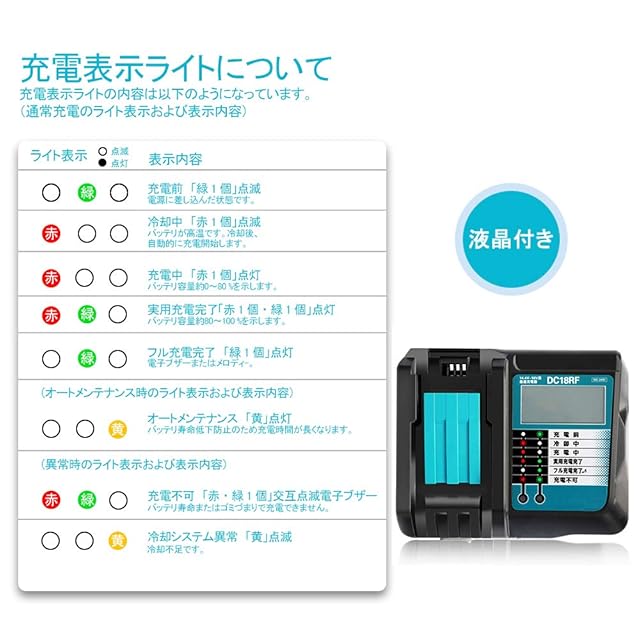 【適用バッテリー】マキタ DC18RF 互換充電器は、マキタシリーズのバッテリーに適合します。bl1450 bl1460 bl1830 bl1840 bl1850 bl1860 bl1430b bl1460b bl1860b bl1830b bl1850b bl1860b bl1890bなど、様々なバッテリーが対応しています。バッテリーに関してご質問がございましたら、出品者までお問い合わせください。お客様のご要望にお応えできるよう、可能な限り迅速かつ正確に回答いたします。バッテリーは消耗品ですが、当社製品はASIN:B09BZ2Z2X9・B09BVPSYXY・B0BTP83BR3・B0BTPB1LSJのバッテリーも対応しており、オプションで購入いただけます。
