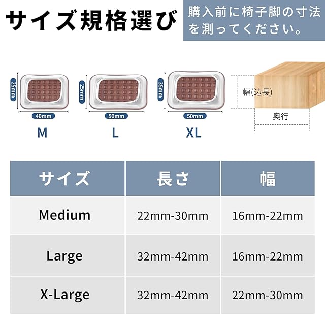 【フェルト椅子脚カバー】パッケージ内容:16個セット。適応サイズ:長さ32mm~42mm、幅22mm~30mm。クリアの部分:シリコン。底部:フェルト。