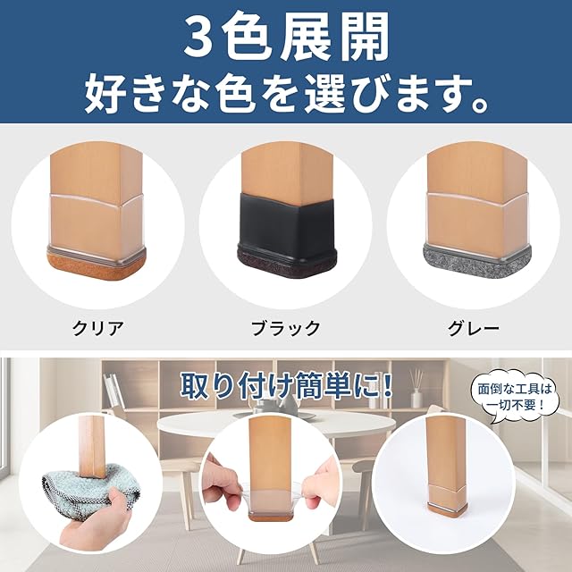 【椅子脚カバーの機能】床傷防止、騒音防止、動きスムーズ、湿気を防ぎ、カビを防ぎ、繰り返し使用可能、洗いやすい(濡れたタオルで拭くことがお勧めです)。指で簡単に装着できるので、工具不要で簡単に取り付けられます。