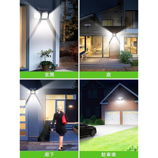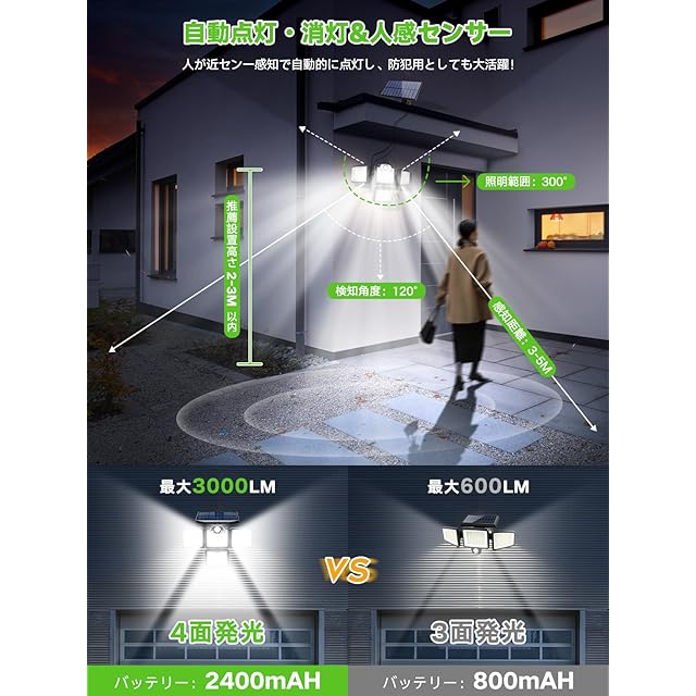 【4面発光調整可能・高輝度LED3000ルーメン】弊社のこのセンサーライトは7000K超高輝度LEDチップを搭載し、3000ルーメン輝度を提供しています。左右両側と下側のライトは自分で角度を調節することができ、360度回転できるので、お好みに合わせて自由に照射方向を変えることができます。照射角度は約300°で、より広い範囲を照らします。