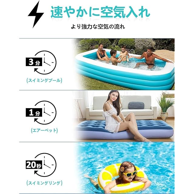 【速やかに空気入れ・空気抜き 両対応】空気入れ及び空気を抜くことが携帯ポンプ一台で対応できます。高品質のモーターと電動 空気入れの高速充填設計により、より強力な空気の流れを提供できます。水泳リングを膨らませるのに10~20秒、キャンプ用エアーベッドを膨らませるのに50~60秒かかります。フットポンプを当社の電動エアーポンプに置き換えることで、時間と労力を節約できます。