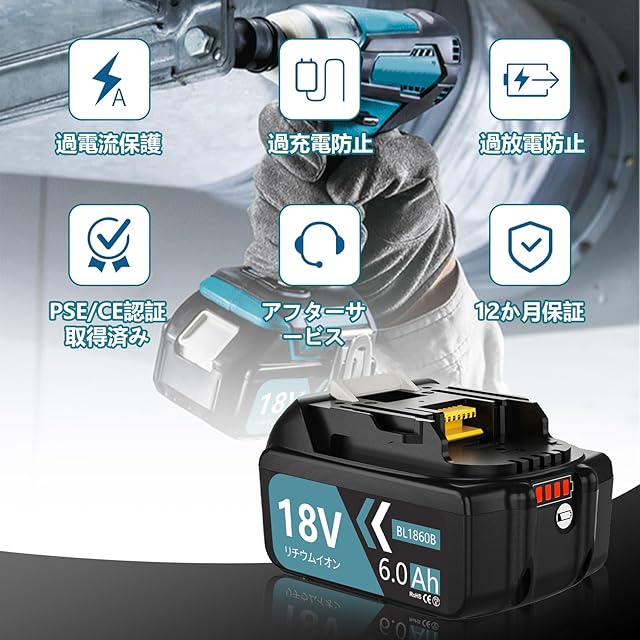 <br>電圧: 18V <br>容量: 6.0Ah <br> 電池種類:リチウムイオン 電池 <br> 認証:PSEマーク CEマーク取得済。 <br><br> 充電方法:充電方法は互換充電器で充電できます 専門的な設備で寿命試験を操作しております。 <br> ①ボタン破壊試験 <br>②バッテリーを充電器に着脱 <br>③バッテリーを充放電 <br> ④落下試験 ダブルで新搭載: 残容量表示 + 自己故障診断 制御基板には充電を制御する保護回路を搭載! <br>①過電流保護機能 <br>②過充電防止機能 <br>③過放電防止機能 <br>保護回路がバッテリー内部セルを壊れないよう守ります。従来品からのバージョンアップ出力を自動停止する機能を搭載しました。これより、電池負担を極限まで低減することができましたので、長寿命化を実現しています 強制冷却で(快速)充電:自己放電が少ないため、長期保存しても満充電 に近い作業が可能です,制御基板には充電を制御する保護回路を搭載! <br><br> 対応機種:バッテリー18V対応の機種対応できます。