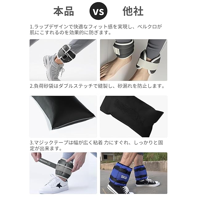 【薄型設計で脚にフィット、運動中もぐらつかない】(5つの小型砂袋で均等分散)重量が分散されるため、一体型のサンドバッグのように滑動せず、ランニングやスクワット時も安定。(高密度鉄砂)通常のサンドバッグより体積30%削減、パンツの下に着用しても目立ちにくい。(二重防漏設計(縫製+内袋))激しい動きでも砂漏れなし。