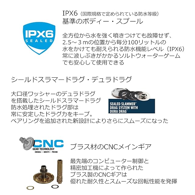 自重(g)425●ギア比6.2●最大ライン巻取(cm)100●最大ドラグ力(Kg)13●ボール/ローラーベアリング8/1●ラインキャパシティナイロン(mm/号)(m) 0.33mm /4号200m●ラインキャパシティPE(号)(m)2.5号300m