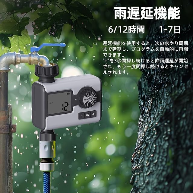 【 雨水遅延と手動モード 】 予期せぬ天候で散水スケジュールが乱れないようにしましょう。ホースタイマーには雨水遅延モードがあり、スケジュールされた散水計画を6時間または12時間、または1〜7日間自動的に一時停止できるため、水を節約し、散水しすぎを防ぐことができます。手動モードでは、スケジュールされたプログラミング設定を中断することなく、必要に応じて柔軟に散水できます。
