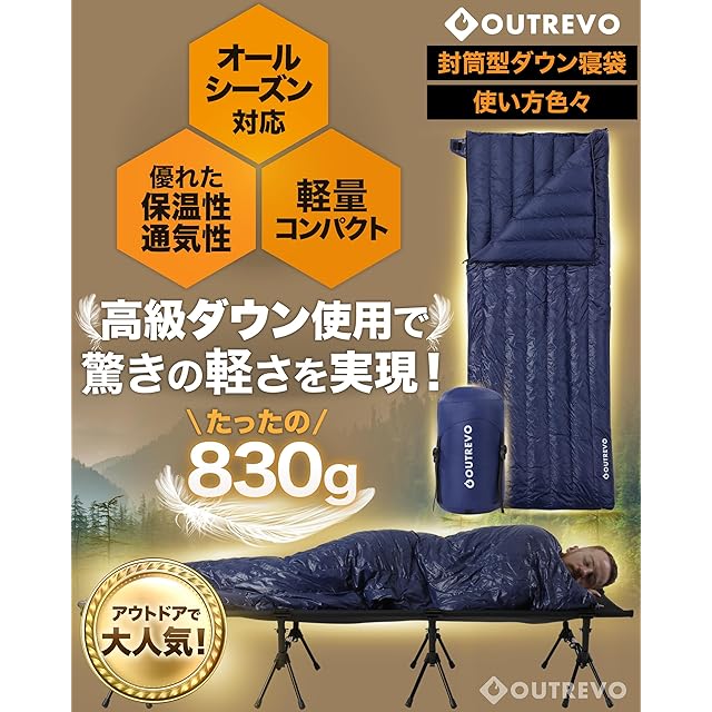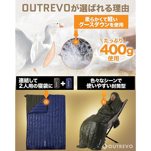 商品名:OUTREVO 寝袋 ダウン 封筒型 軽量 グースダウン 400g 連結してふたり用に コンパクト シュラフ アウトレボ (ネイビー)
