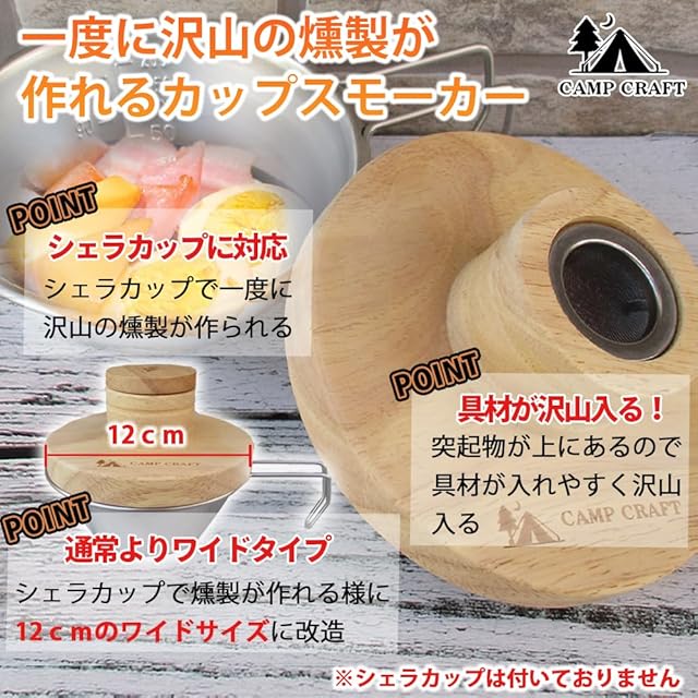 自分が持っているシェラカップで簡単燻製が作れる。 人気のスモーク系の食べ物、チーズ、サーモン、ナッツ、うずら卵、ウィンナーいろいろ作れる グラストップスモーカー、カクテルスモーカーとしても使える シェラカップの大きさ12cmに対応 高密度フィルター使用 →灰チップがこぼれ落ちない